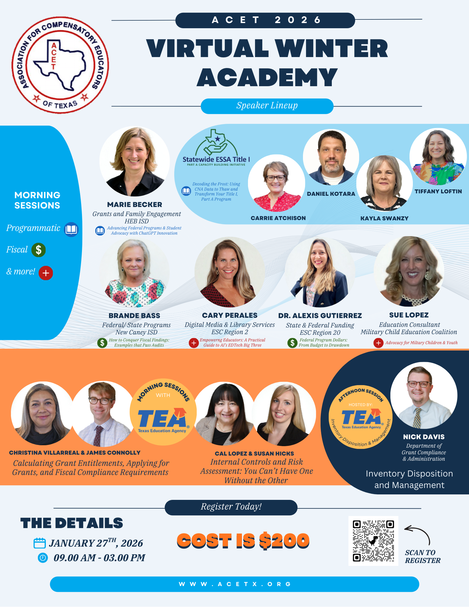 Each academy features 8 total sessions, including four focused tracks—Programmatic, Fiscal, TEA, and Other—plus one TEA-led general session. The Winter Academy will open with a TEA general session on Inventory Disposition and Management, while the Spring Academy highlights a follow-up TEA session focused on Time and Effort.
