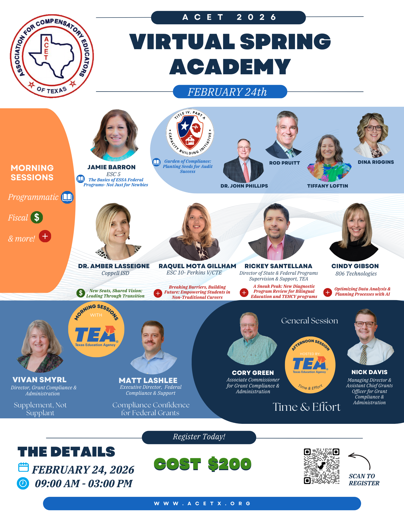 Each academy features 8 total sessions, including four focused tracks—Programmatic, Fiscal, TEA, and Other—plus one TEA-led general session. The Winter Academy will open with a TEA general session on Inventory Disposition and Management, while the Spring Academy highlights a follow-up TEA session focused on Time and Effort.
